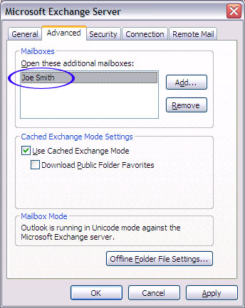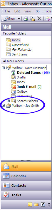 Click Next. Click Finish. Now, you will see the other user's mailbox in the folder list on the left side. When you expand that mailbox, you will see the calendar, contacts, and inbox for the new user.